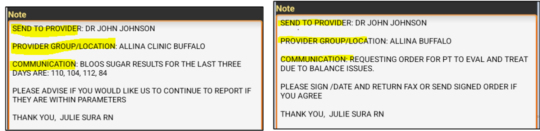 - Coordination note will sync back to the office when visit note or device is synced. Back office staff will fax to provider listed.